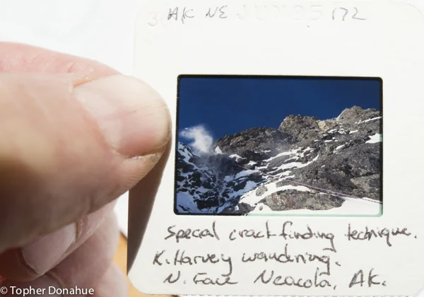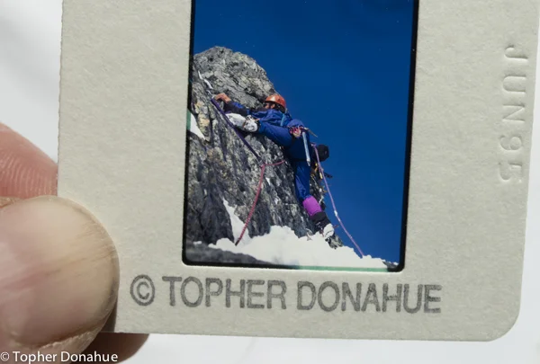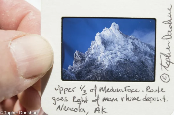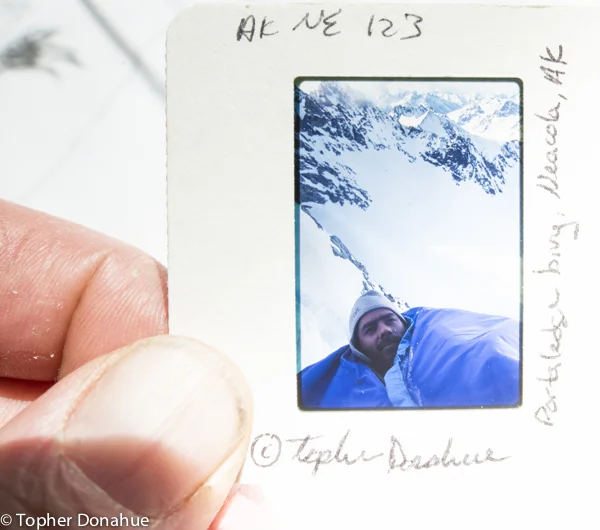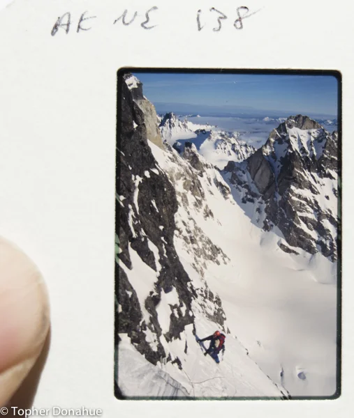 This year, Sam made it into the Neacola Range and took some photos of the face Kennan and I tried. In the process of online discussion with Sam and his friends, they asked if we had any climbing photos from the ascent. I was about to scan some of my slides, but decided for a more fitting way to share the experience and the world of adventure story-telling before Facebook, Instagram, GoPros, drones, and even the Internet, I would photograph the slides themselves.